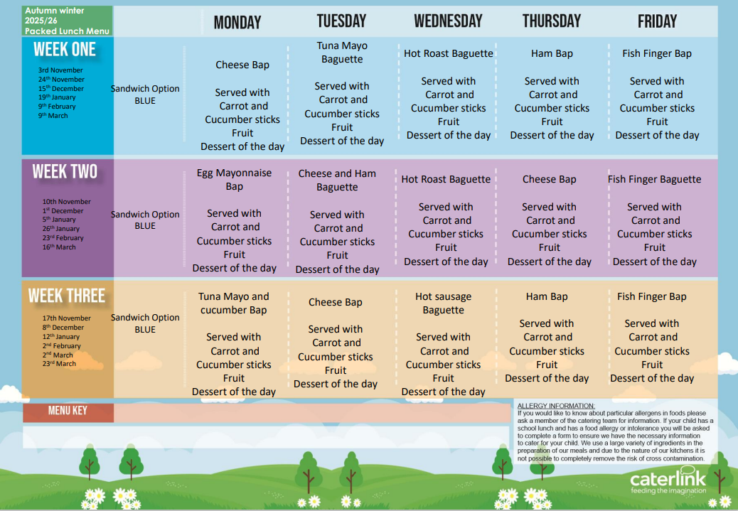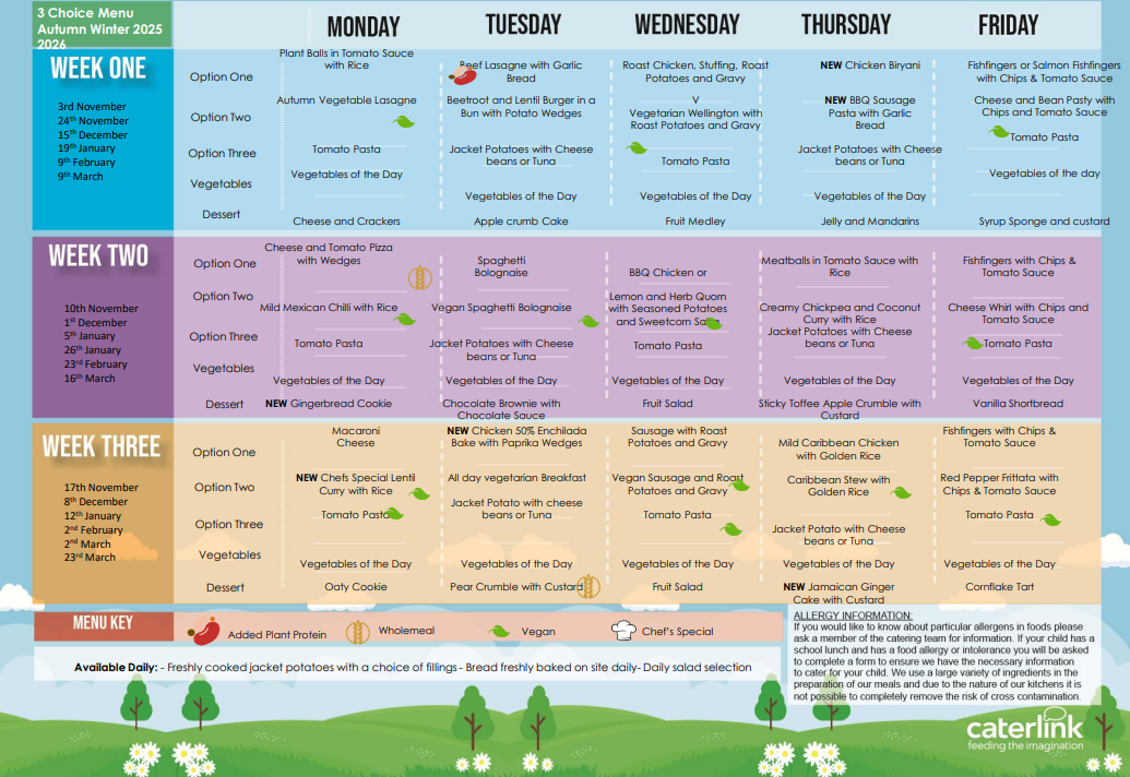 School means are available each day. The meals are not cooked on-site but transported to school and then served here. The menu is below, should you require a paper copy – please do not hesitate to ask the school office.