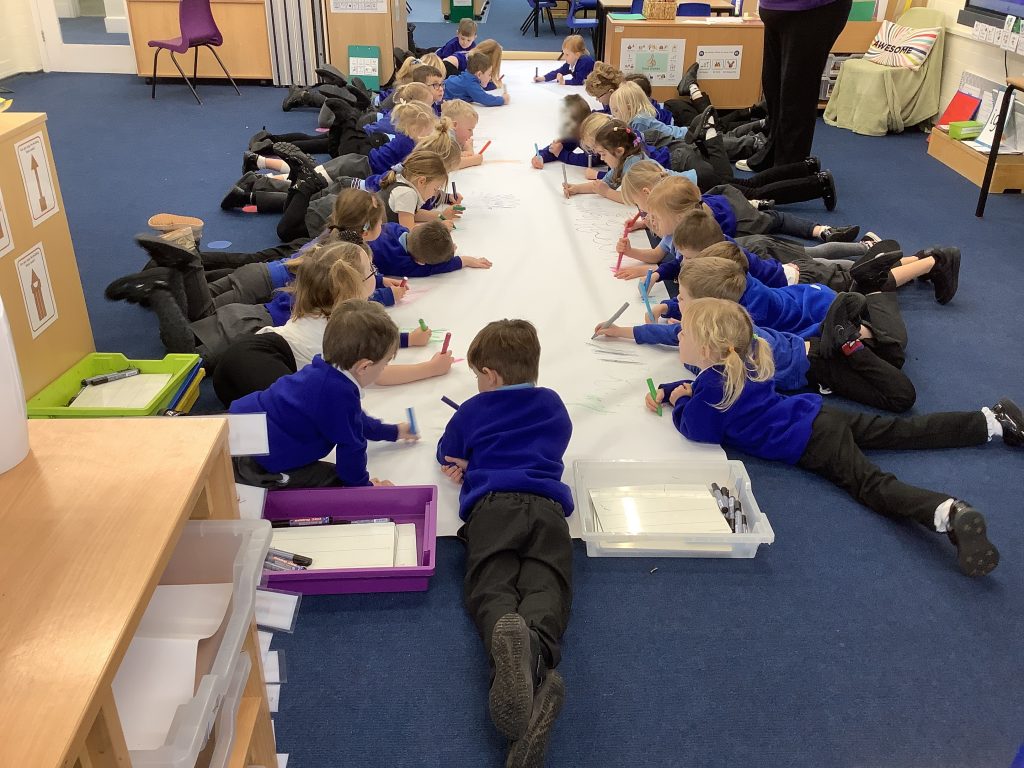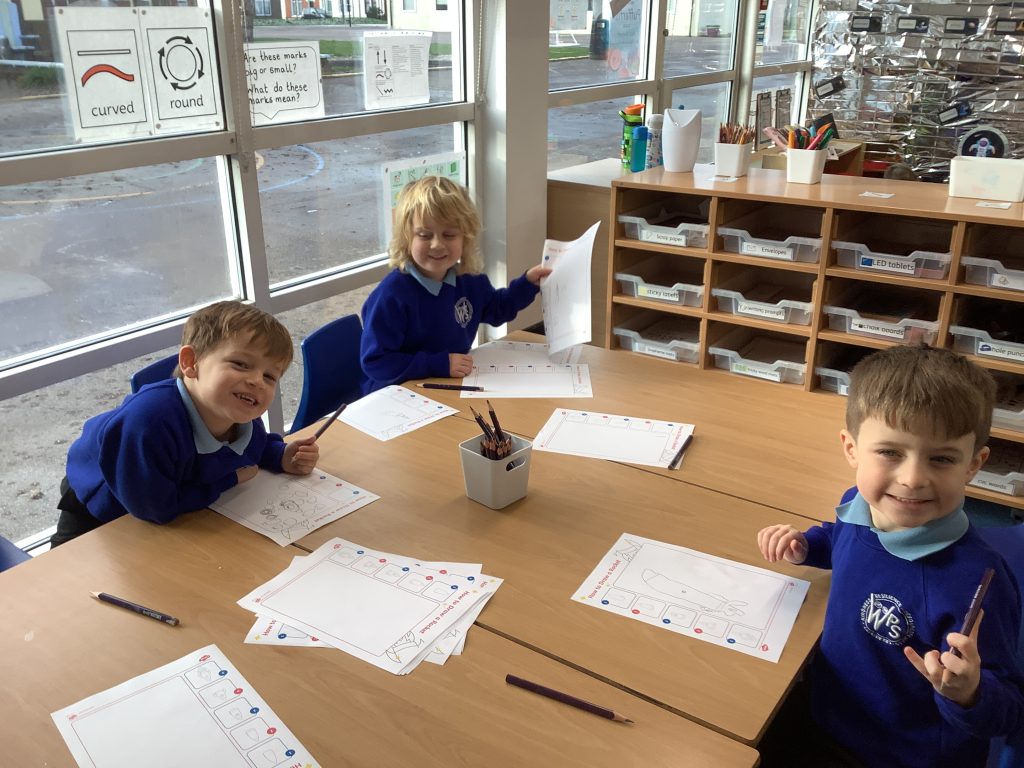 During our handwriting sessions, we have been focusing on directional strokes, practising up and down movements. We enjoyed doing this to Uptown Funk by Bruno Mars before moving onto the carpet to make large marks on the floor together as a whole class. Next week, we will begin working on the ladder letter group: l, t, u, y, i, and j. Correct letter formation is an important skill to establish in the early stages of handwriting.