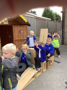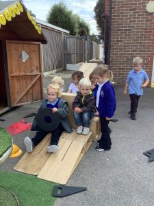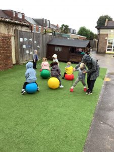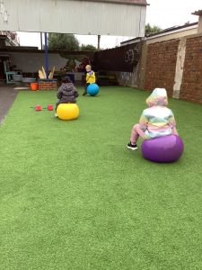 This week we had our first official PE lesson, we were able to throw bean bags into the hoops, follow the maze on the floor and walk along the bench, jump and land correctly.